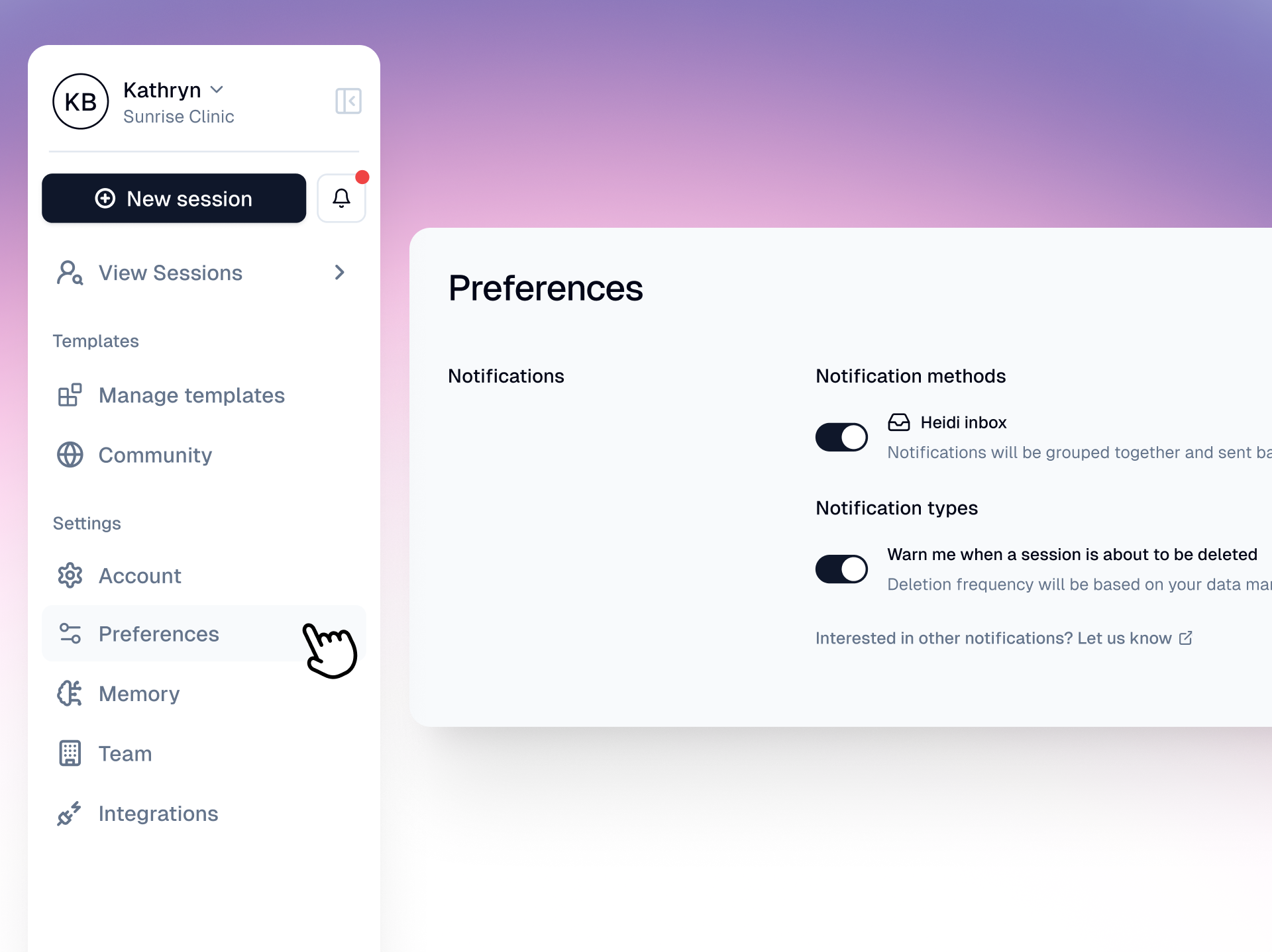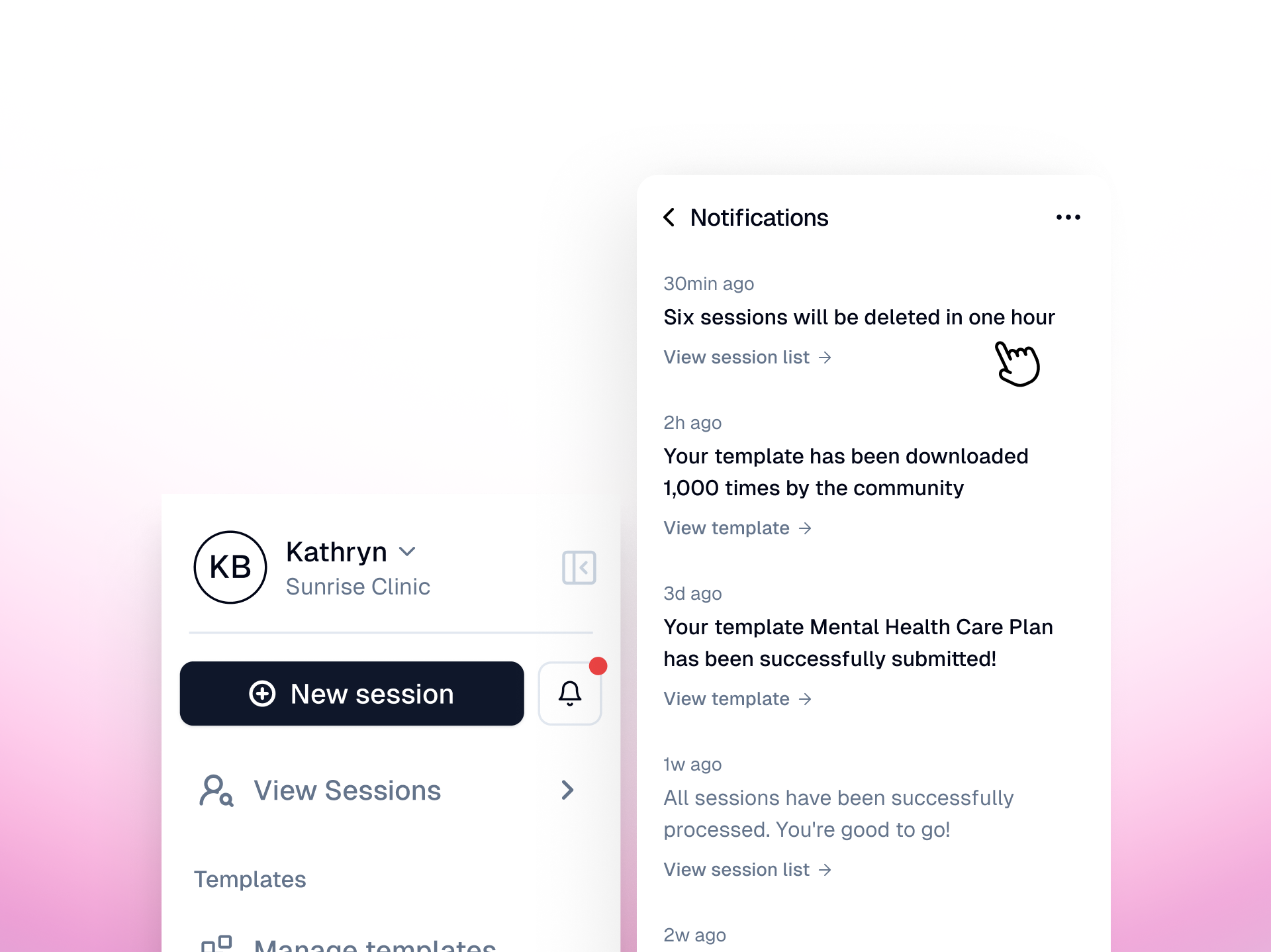 Currently, the notification panel will serve reminders that sessions are going to be deleted shortly, provided you’ve set an automatically scheduled deletion in your Preferences.